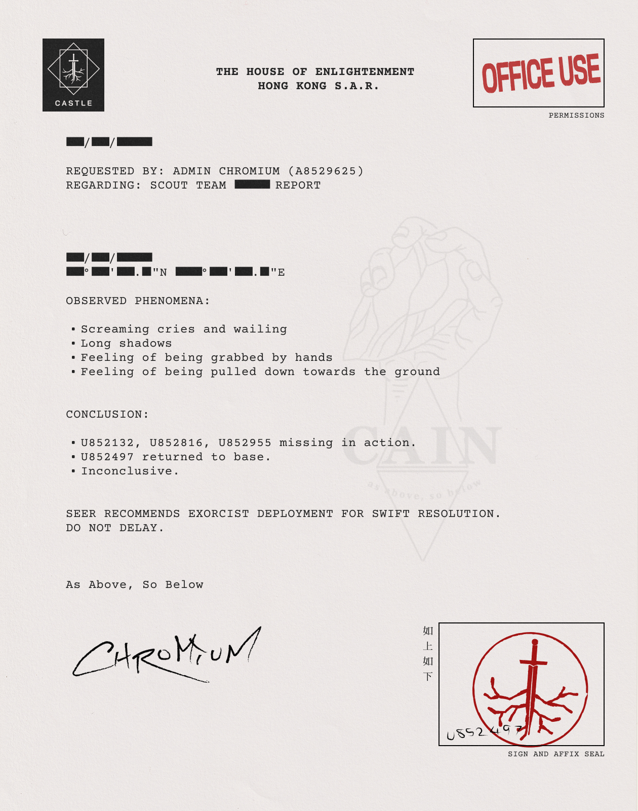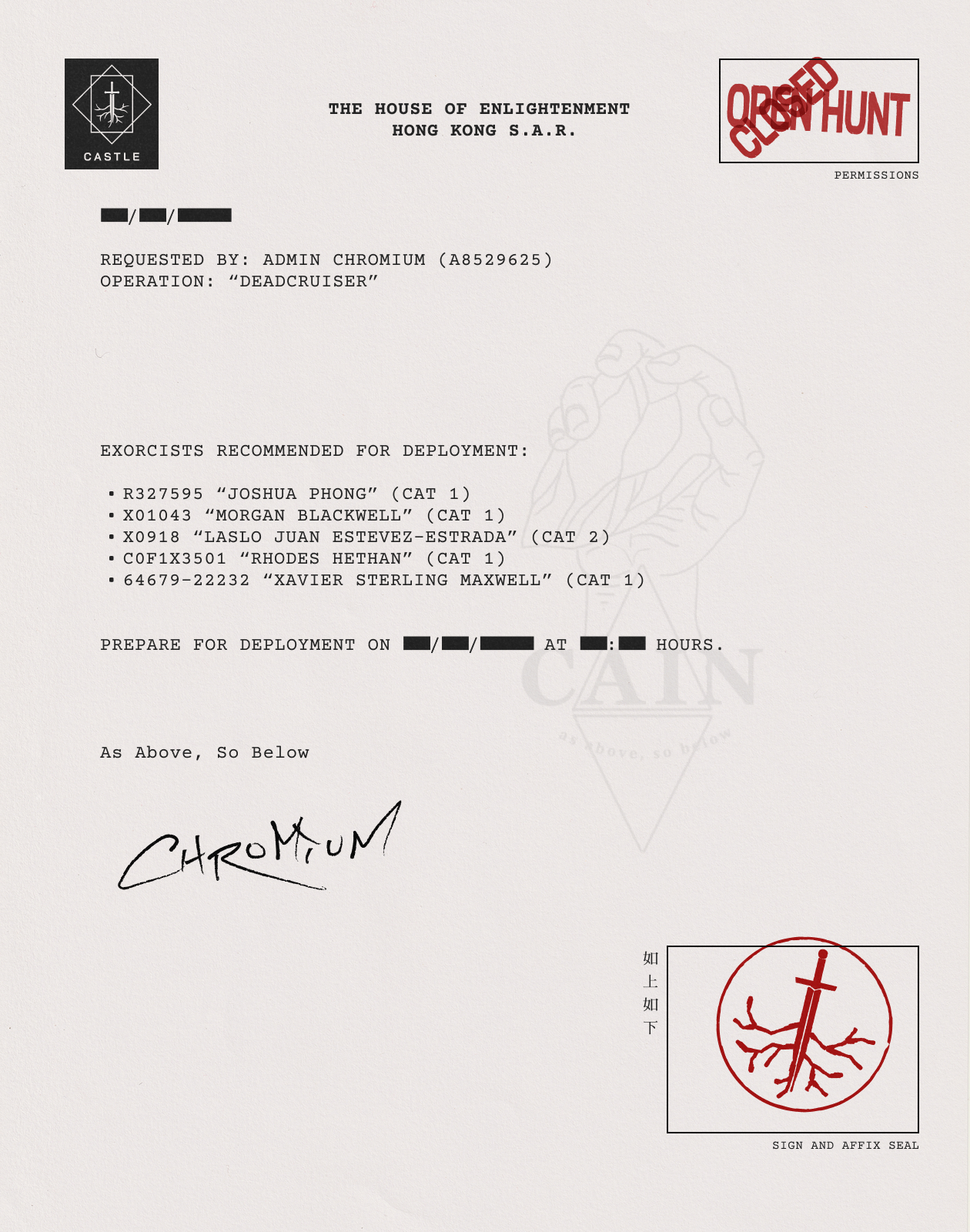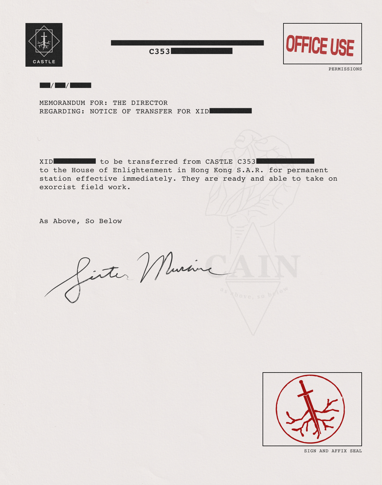CAIN corporate stationery (for the ttrpg CAIN by Tom Bloom)
